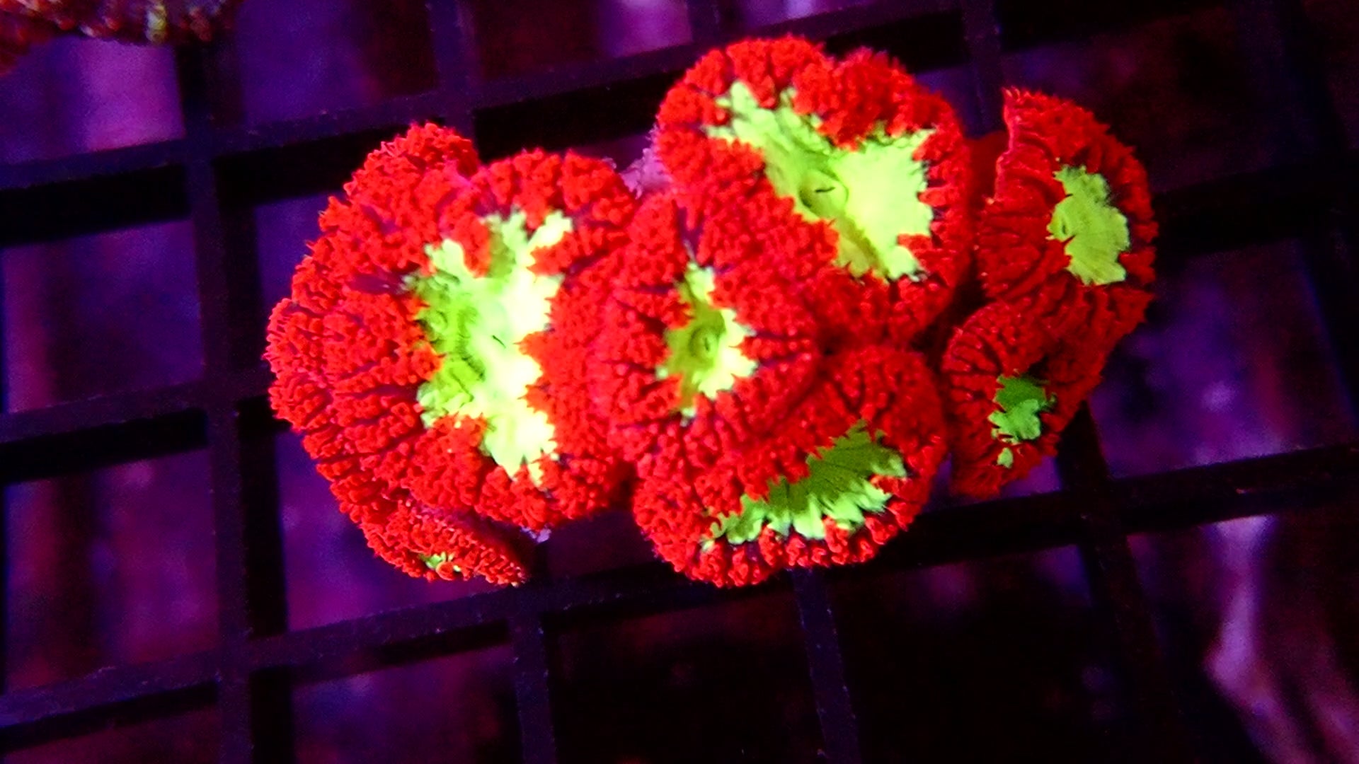 Magnifique colonie de Blastomussa Ultra aux couleurs spectaculaires rouge vif et vert lime fluorescent. Ce corail LPS exceptionnel présente de multiples polyps charnus avec des centres vert éclatant entourés de tentacules rouge intense.